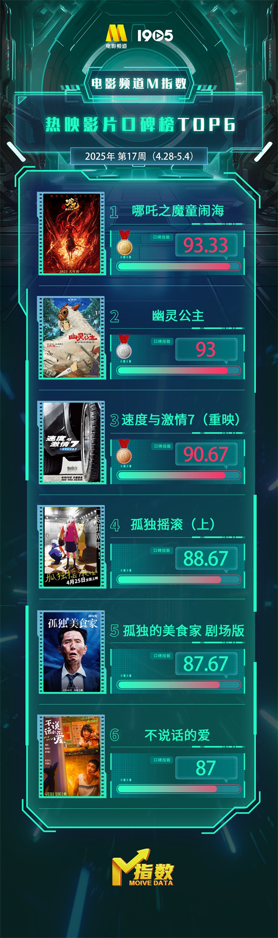 1905电影网讯 “电影频道M指数”2025年第17周结果发布。4月28日-5月4日,“电影频道M指数”热映影片口碑榜前6位依次为: