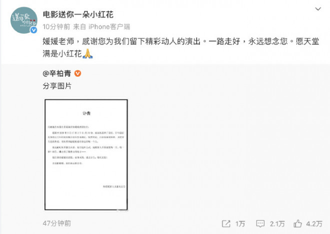 1905电影网讯 5月21日,电影《送你一朵小红花》官微转发朱媛媛讣告悼念,“媛媛老师,感谢您为我们留下精彩动人的演出。一路走好,永远想念您。愿天堂满是小红花”。