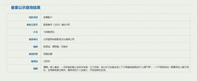 1905电影网讯 据国家电影局最新备案、立项公示,电影《10间敢死队》立项,编剧为陈思诚、谭丽莹、石晓宇,备案单位为北京壹同传奇影视文化有限公司。