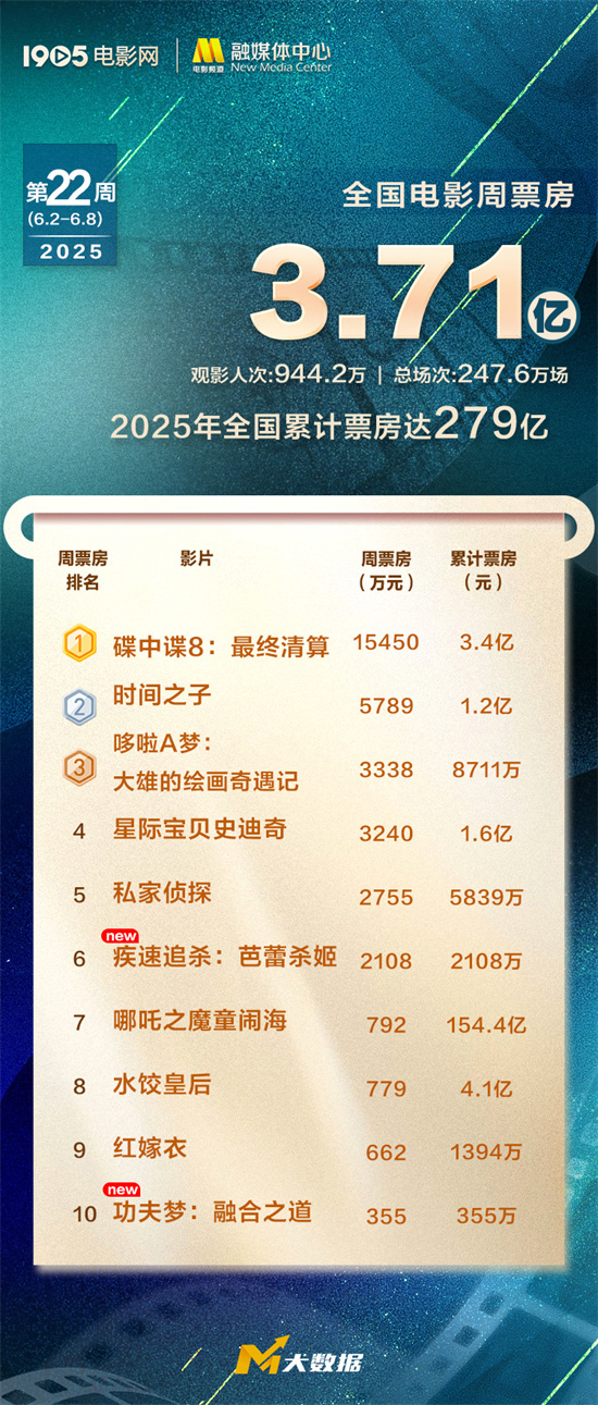 1905电影网讯 2025年第22周(6.2-6.8)全国电影周票房3.71亿元,观影人次超944万,2025全年电影票房累计279亿元 。