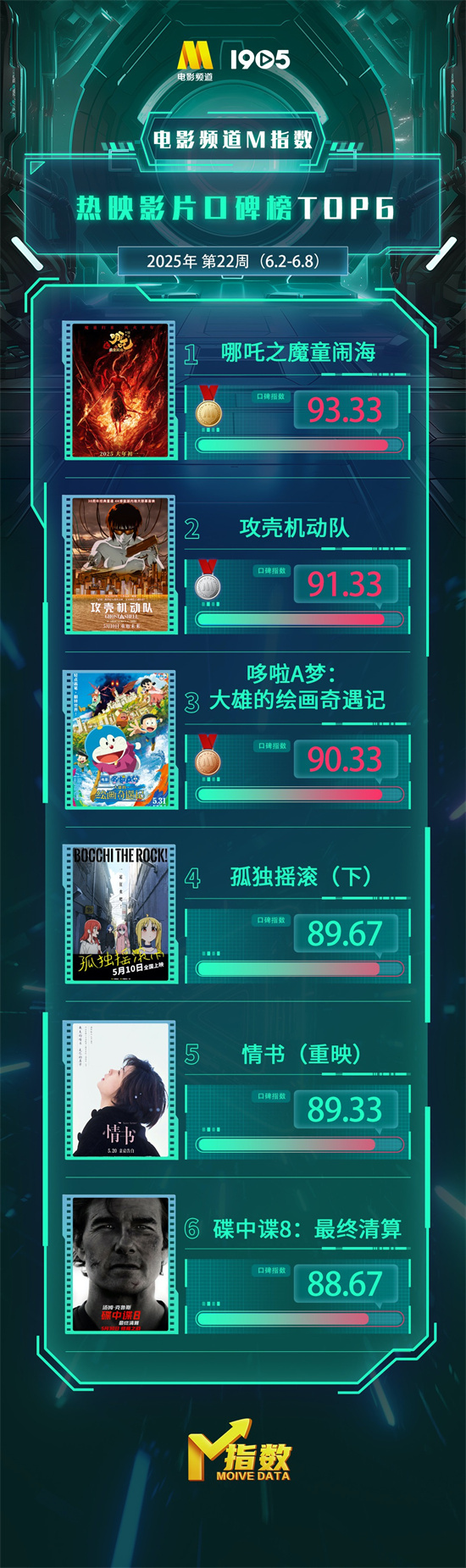 1905电影网讯 “电影频道M指数”2025年第22周结果发布。6月2日-6月8日,“电影频道M指数”热映影片口碑榜前6位依次为: